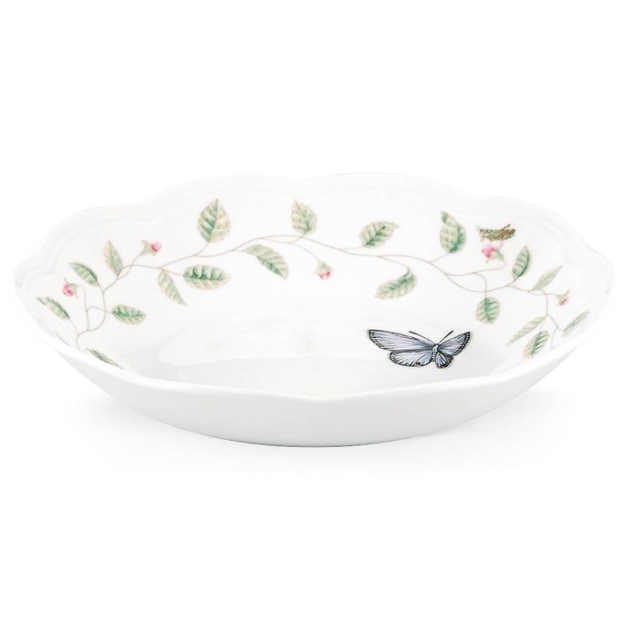 Ягаан нахиалж буй цэцэг, эрвээхэй, царцаа гээд Butterfly Meadow цуглуулаганы хээтэй энэхүү бат бөх цагаан шаазан шаазан аяга нь аяга таваг угаагч болон богино долгионы зууханд аюулгүй бөгөөд эрвээхэй нугын цуглуулганы гайхалтай нэмэлт таваг болно.